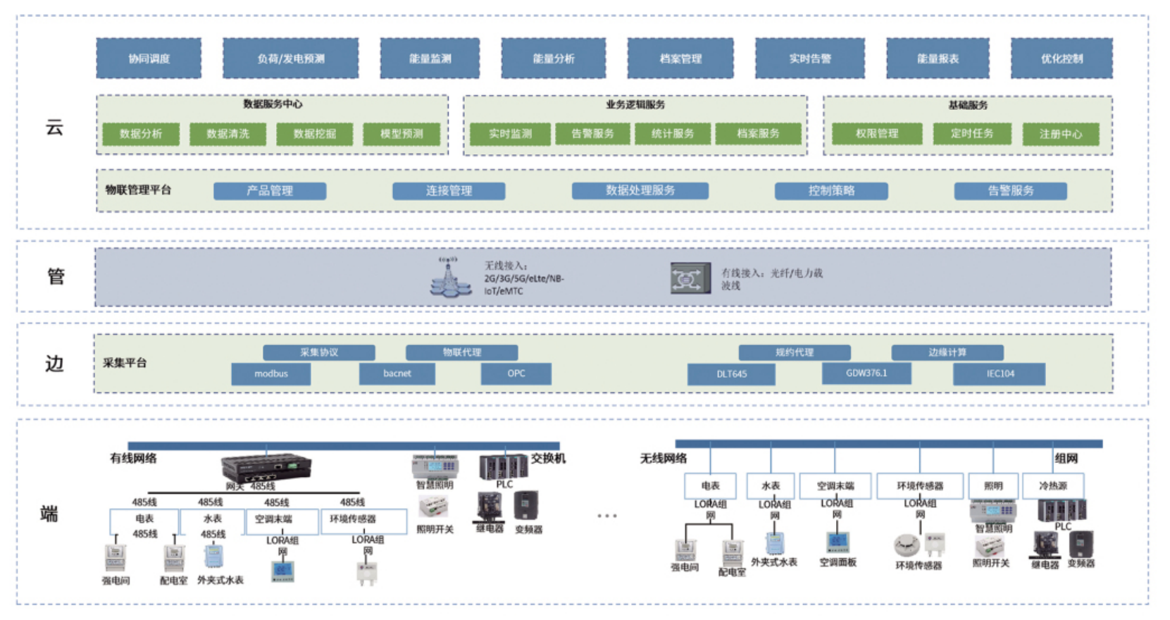 園區(qū)低碳智慧能源管理系統(tǒng)通過自動采集現(xiàn)場設(shè)備、儀表實時數(shù)據(jù)以及人工錄入的基礎(chǔ)資源數(shù)據(jù),利用計算機網(wǎng)絡(luò)送入系統(tǒng)數(shù)據(jù)庫進(jìn)行存檔、統(tǒng)計和分析,實現(xiàn)負(fù)荷預(yù)測和源網(wǎng)荷儲協(xié)同調(diào)度,還可與企業(yè)的設(shè)備、庫存以及工序、成本管理系統(tǒng)進(jìn)行數(shù)據(jù)融合,實現(xiàn)資源節(jié)約效果和環(huán)保收益核算,實現(xiàn)設(shè)備的高效運行。