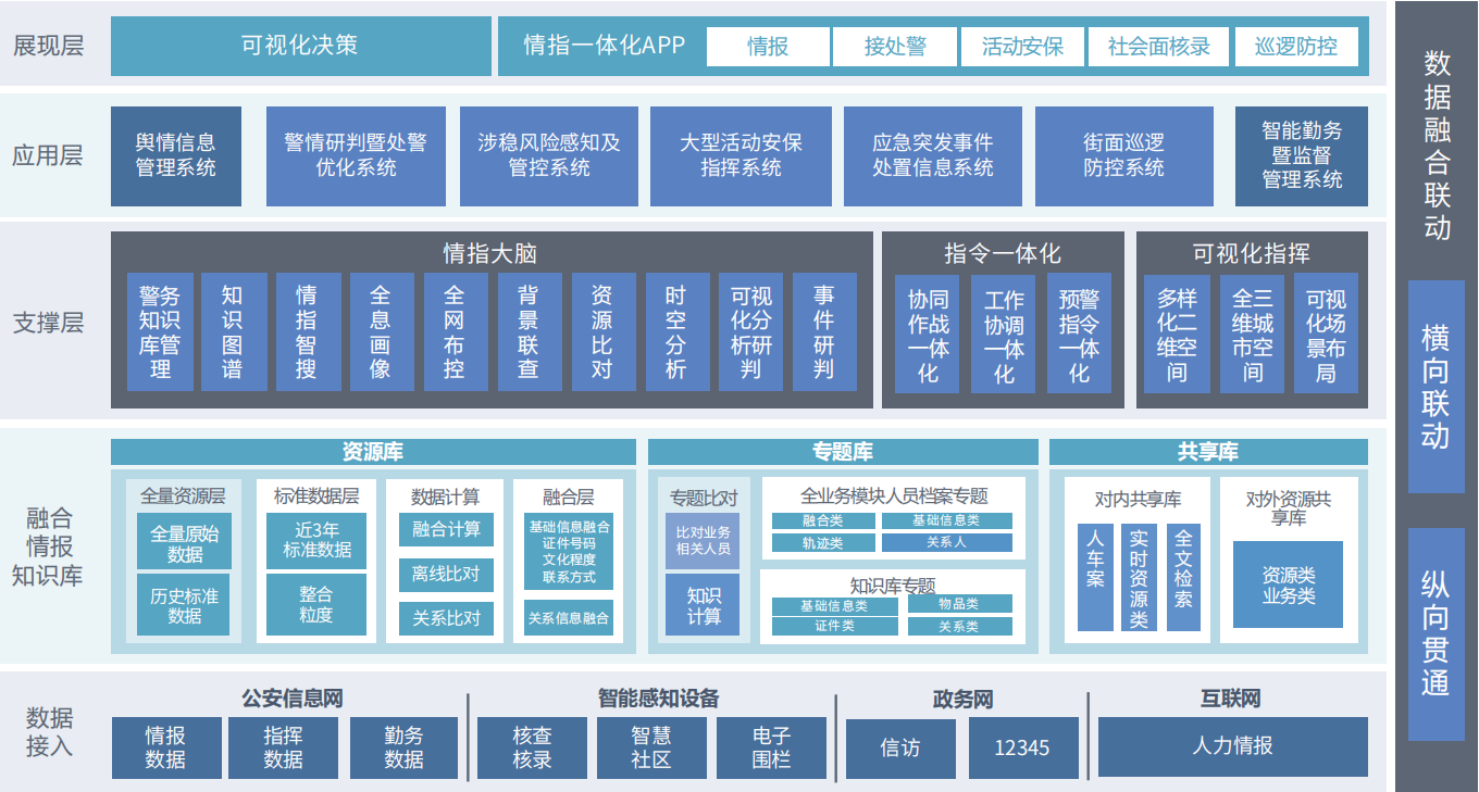 情指一體化綜合實(shí)戰(zhàn)平臺(tái)按照“情指一 體化1+1>2”的總體思路,依托警務(wù)云的各類(lèi)數(shù)據(jù)資源,將情報(bào)、指揮、勤務(wù)、行動(dòng) 等業(yè)務(wù)應(yīng)用進(jìn)行高度融合,以“ 情 指 大 腦”、“指令一體化”、“警務(wù)要素可視化”為核心,支撐處警優(yōu)化 、社會(huì)維穩(wěn) 、巡邏防控、活動(dòng)安保、應(yīng)急處置等業(yè)務(wù)應(yīng)用場(chǎng)景。 最終實(shí)現(xiàn)公安 “看得見(jiàn)、呼得通、調(diào)得動(dòng)、 能研判、防得住”的警務(wù)實(shí)戰(zhàn)新需求。